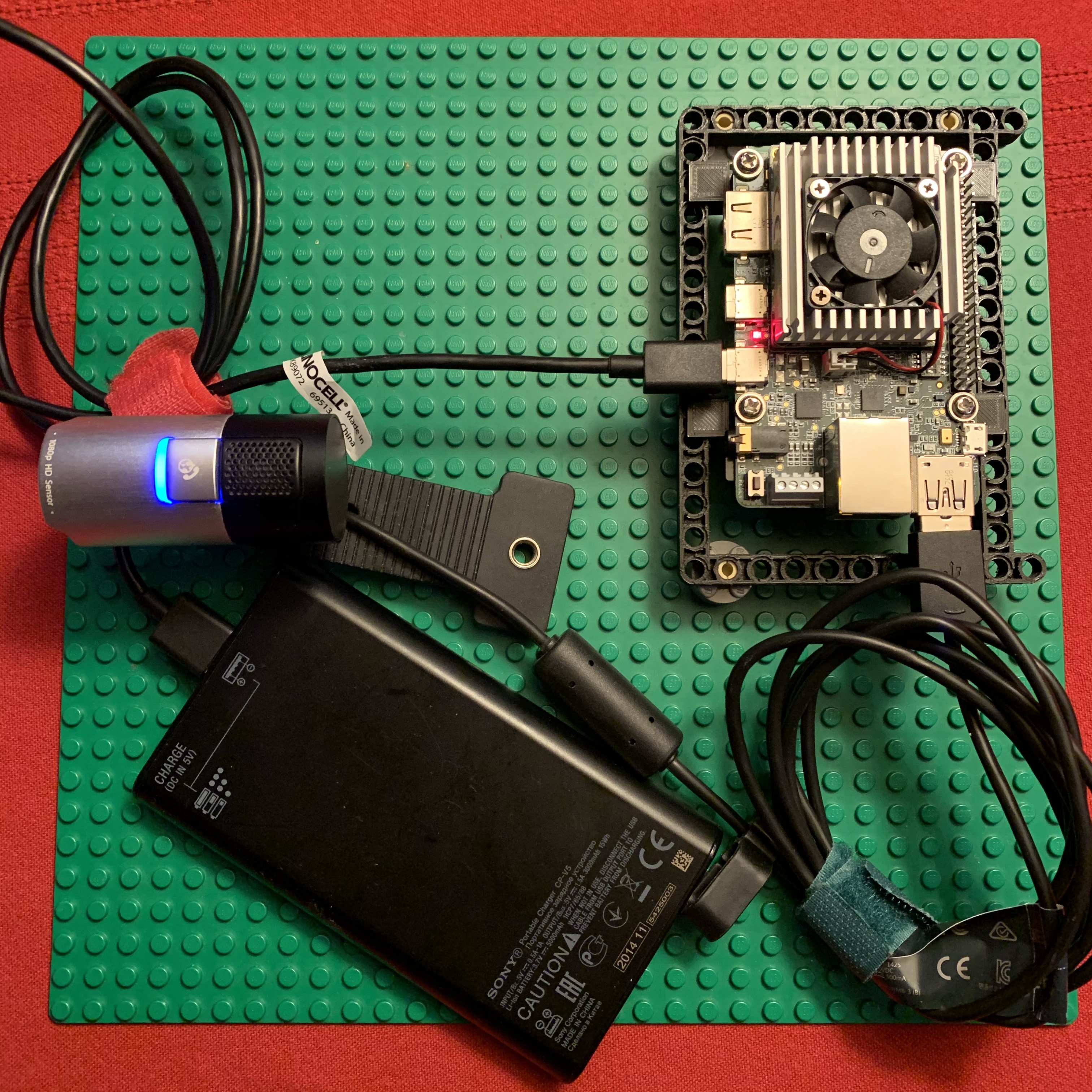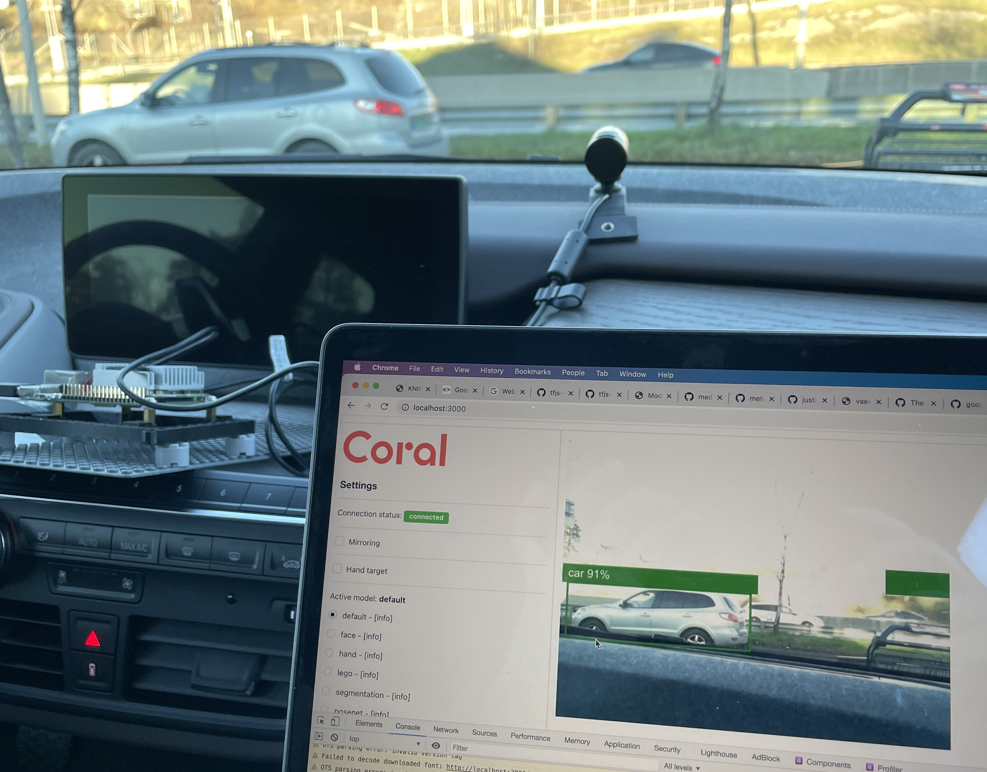 As it can be seen on the pictures at the intro section of the article, I managed to take my coral board to a ride at the end. My set up was including a mobile charger battery, the Coral board, mounted on a gray LEGO plate, a webcam, an iPad and my laptop. In the car I started up the board, which created a 'CoralNet', with my laptop I connected to the 'CoralNet', and through ssh loged in to the board and started up my servers. Also connected my iPad to 'CoralNet', got out from the car and connected to the frontend server runing on the board. This way I could test most of the models my server is supporting. You can see that a 'car' is detected next to a 'person', face detection model detected my face, and the segmentation model segmented me green.