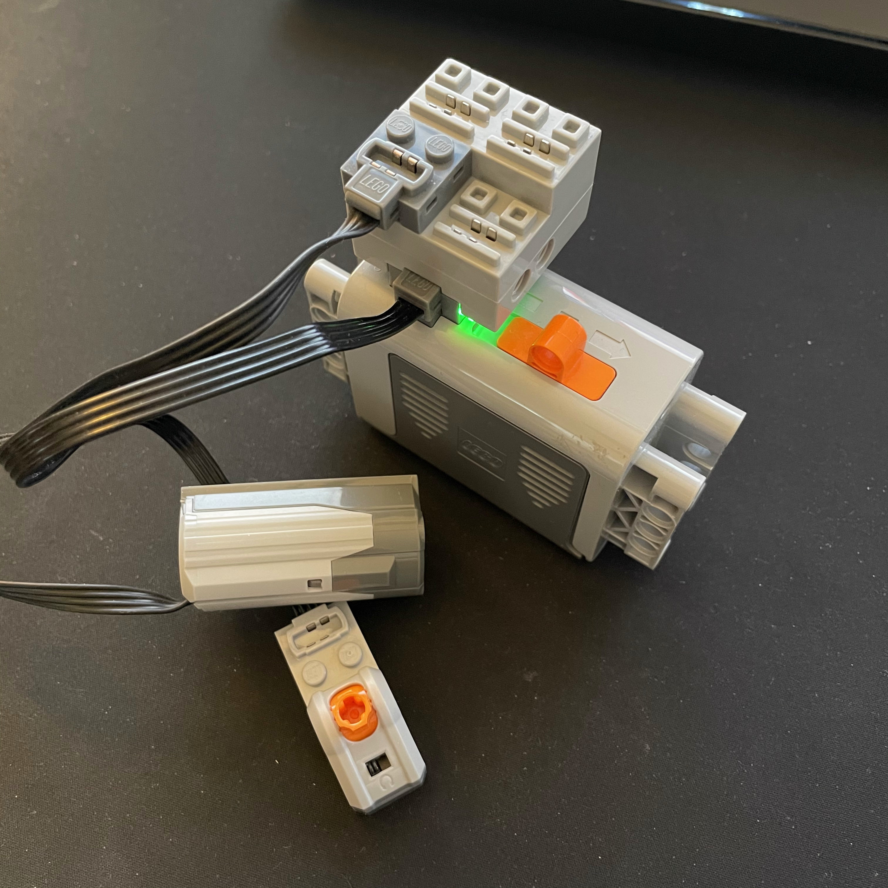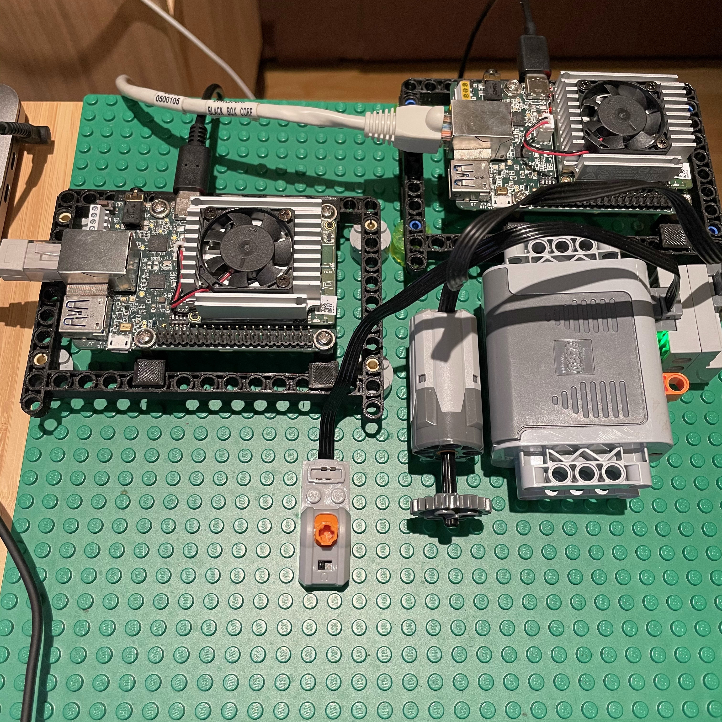 As you can see on one of the pictures above, I have several boards, so I deployed the code on 2 of those, and built a little concept LEGO 'crane'. One of the boards sent the command HALF_SPEED_FW, thereafter the other HALF_SPEED_BW.