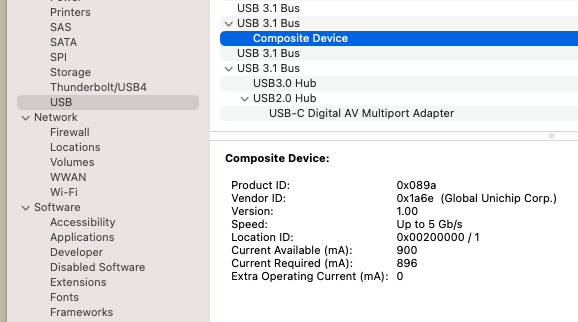 Using lsusb the device appears as 'Global Unichip Corp. Composite Device'